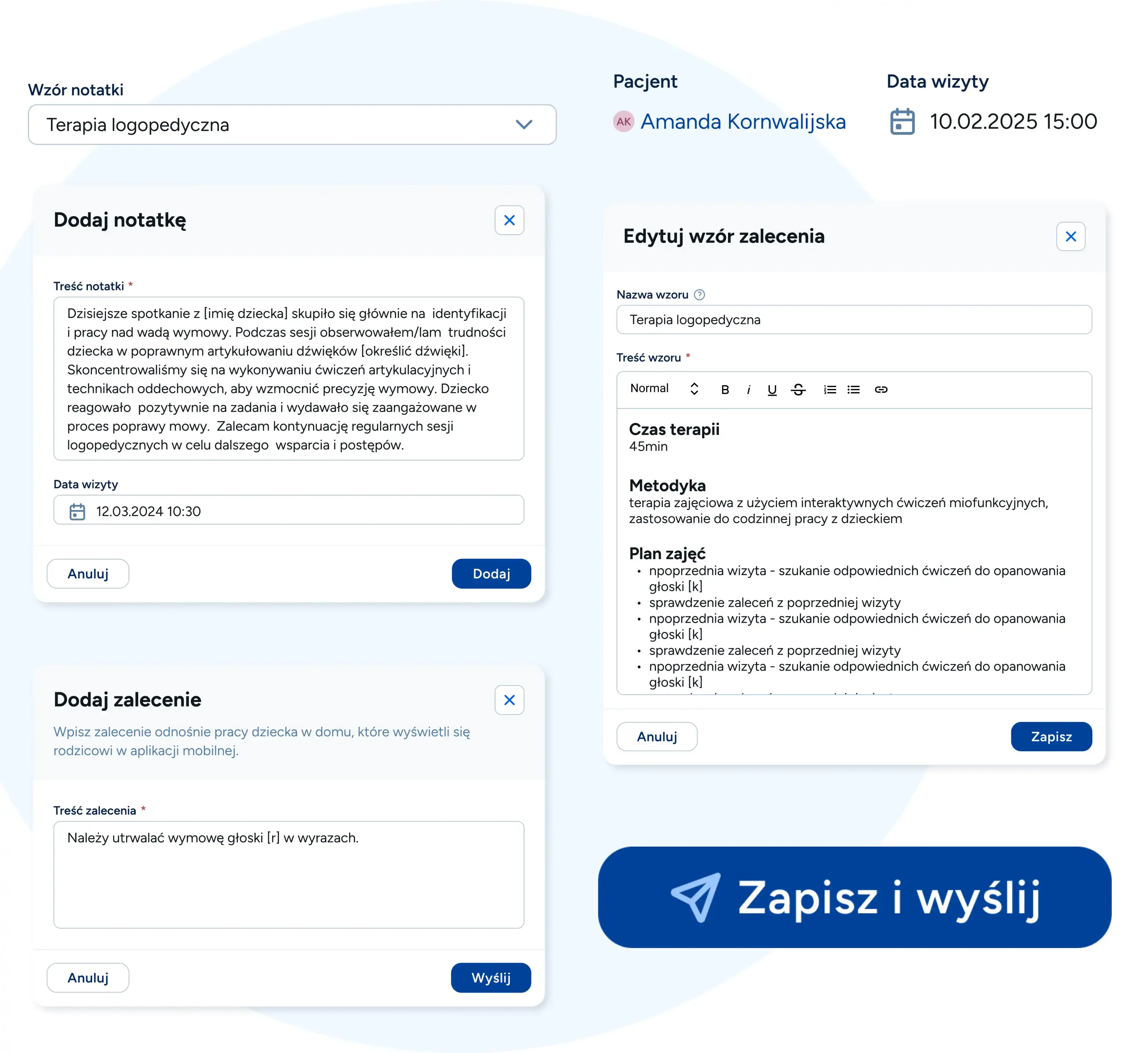 Nie trać czasu na powtarzanie tych samych czynności. Korzystaj z gotowych lub twórz własne, niestandardowe szablony i wysyłaj zalecenia jednym kliknięciem. Nasz system dba o spójność dokumentacji, **ułatwiając pracę całego zespołu na wspólnych wzorach**, i podpowiada, o co zapytać, eliminując ryzyko pominięcia kluczowych informacji.